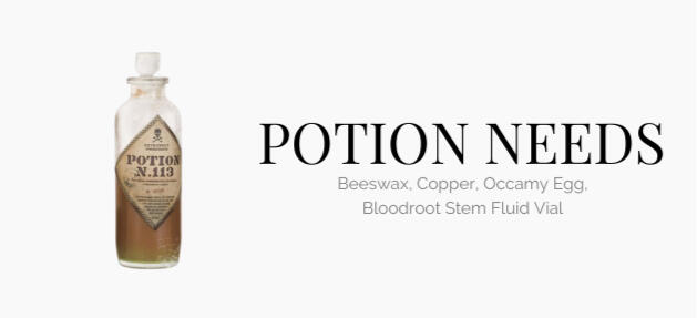 Bahan-bahan ramuan wajib dibeli setiap akan diadakannya kelas praktek potion.Pembelian bahan ramuan dilakukan segera setelah Professor yang bersangkutan memberitahu ramuan apa yang akan di pelajari. Batas akhir pembelian ramuan adalah satu jam sebelum kelas. Lebih dari itu, tidak akan dilayani dan silahkan menghadap ke professor yang bersangkutan.Barang-barang diatas sudah berbentuk paket, dimana sudah disesuaikan dengan takaran yang dibutuhkan untuk membuat setiap ramuanNotes: Untuk bahan yang tidak tertera diatas, harga akan diberikan langsung oleh Manager The Coffin House and Clinic.Bahan-bahan wajib dibeli oleh wizard Grade 1-5, dengan catatan G1 Newbie membeli dengan setengah harga. Jadi bila G2 - G5 total membeli 40C, G1 Newbie hanya perlu membayar 20CPembelian yang dilakukan oleh G1 Newbie disertai bukti ID Card (Jika sudah memiliki), atau screen shot pemberian ID saat SKC (Yang memperlihatkan tanggal tweet).this is a spacer